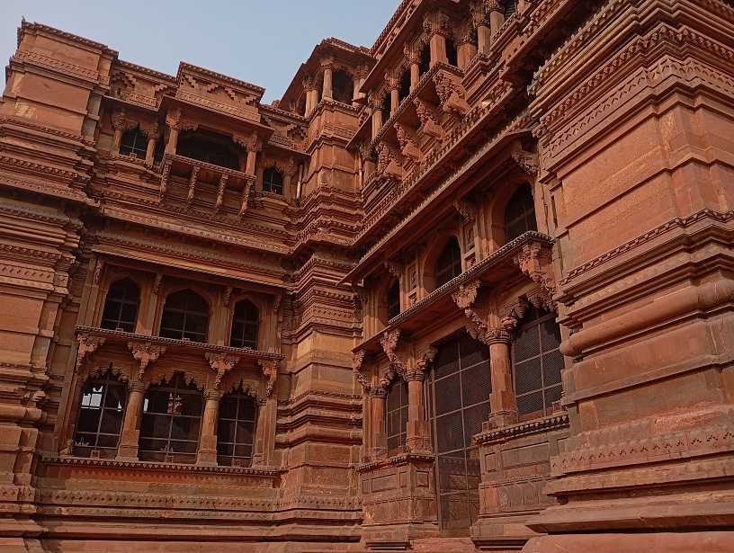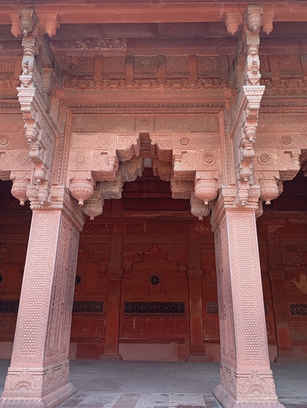 Agros fortas. Tai didžiulis raudono smiltainio fortas, pastatytas XVI a. Mogolų imperijos valdovo Akbaro laikais (1565–1573 m.). Jis buvo karinė bazė, bet tuo pat metu – imperatoriaus rezidencija ir administracijos centras. Fortas nėra tik viena pilis – tai visas maždaug 380 metrų ilgio ir 240 metrų pločio kompleksas su: rūmais, mečetėmis, sodais, tvirtovės sienomis, bastionais ir vartais. Fortas buvo statytas hindu ir islamo stiliaus deriniu, ypač Akbaro laikais. Vėliau mogolų imperatoriai, įskaitant Šachą Džahaną, pridėjo įspūdingų marmuro rūmų ir dekoracijų.